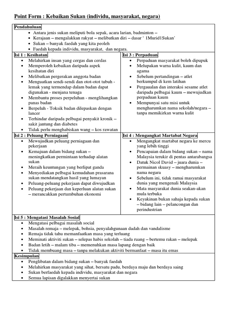 Point Form Kebaikan Sukan Kepada Individu Masyarakat Dan Negara