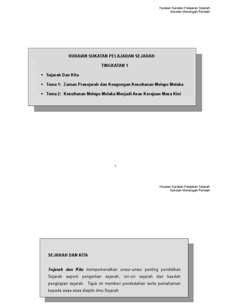 Huraian Sukatan Pelajaran Sejarah Tingkatan 1 Sejarah Dan Kita Tema 1 Zaman Prasejarah Dan Keagungan Kesultanan Melayu Melaka Tema 2 Kesultanan Melayu Melaka Menjadi Asas Kerajaan Masa Kini