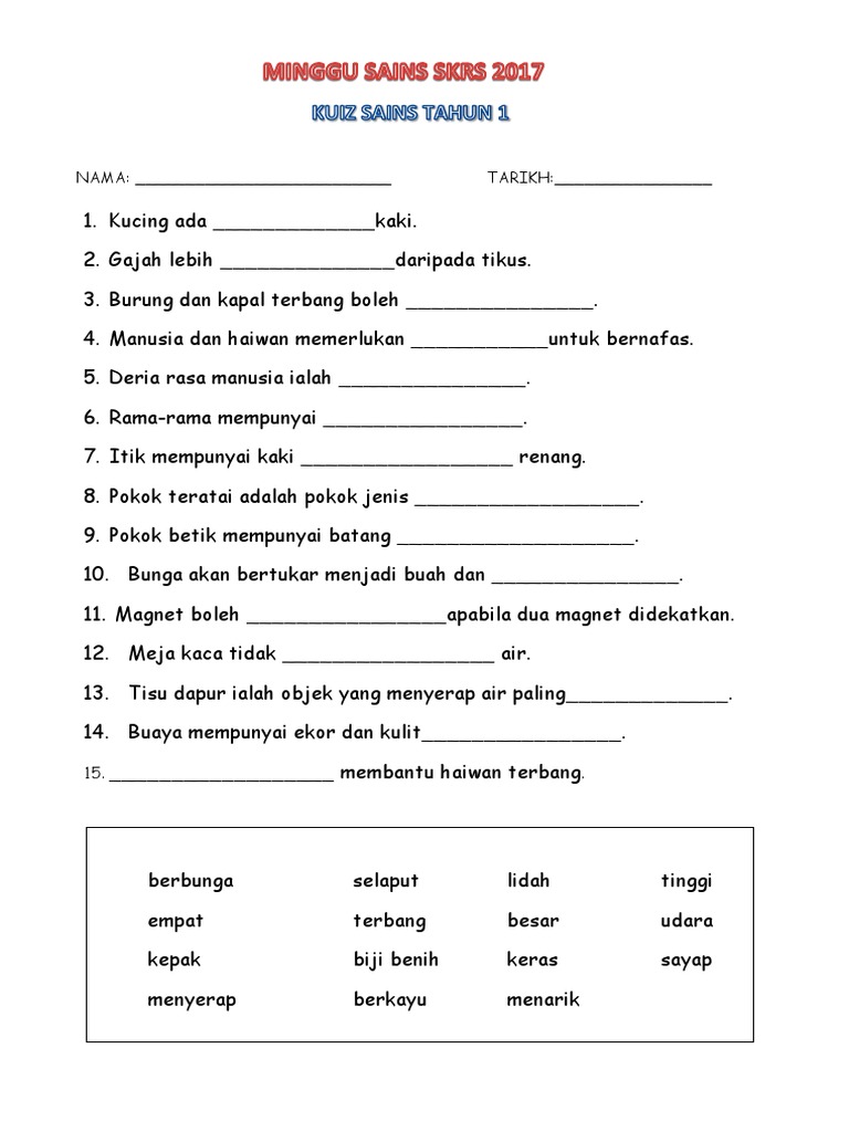 Quiz Sains Tahun 1 Sumber Pengajaran