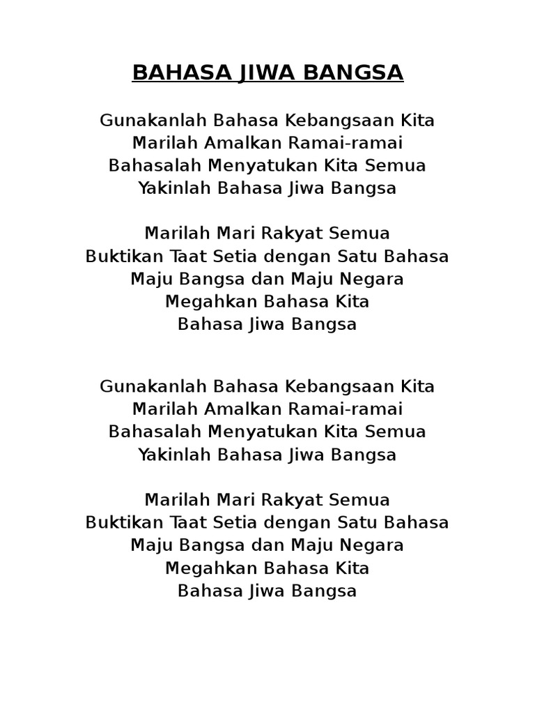 Marilah bersama sama menjayakan bulan bahasa kebangsaan. Telah terbiasa menyanyikan lagu ini sejak zaman sekolah pada saat upacara bendera lagu ini juga kerap dikumandangkan saat atlet indonesia meraih. Yakinlah bahasa jiwa bangsa marilah mari rakyat semua buktikan taat setia dengan satu bahasa maju bangsa dan maju negara megahkan bahasa kita bahasa jiwa bangsa. Posted by unknown at 07 35.