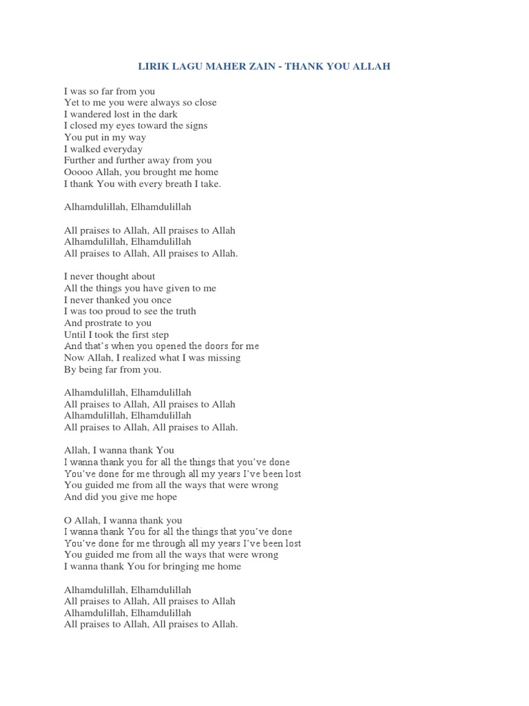Thank you allah maher zain i was so far from you dulu aku sangat jauh dari mu yet to me you were always so close tapi kau selalu dekat denganku i wandered lost in the dark. Lirik lagu maher zain thank you allah dan terjemahan i was so far from you aku begitu jauh dari mu yet to me you were always so close sebelumnya engkau selalu begitu dekat i wandered lost. Seluruh media termasuk lirik lagu ataupun kunci gitar chord gitar yang terdapat di situs ini hanyalah untuk keperluan promosi dan evaluasi.