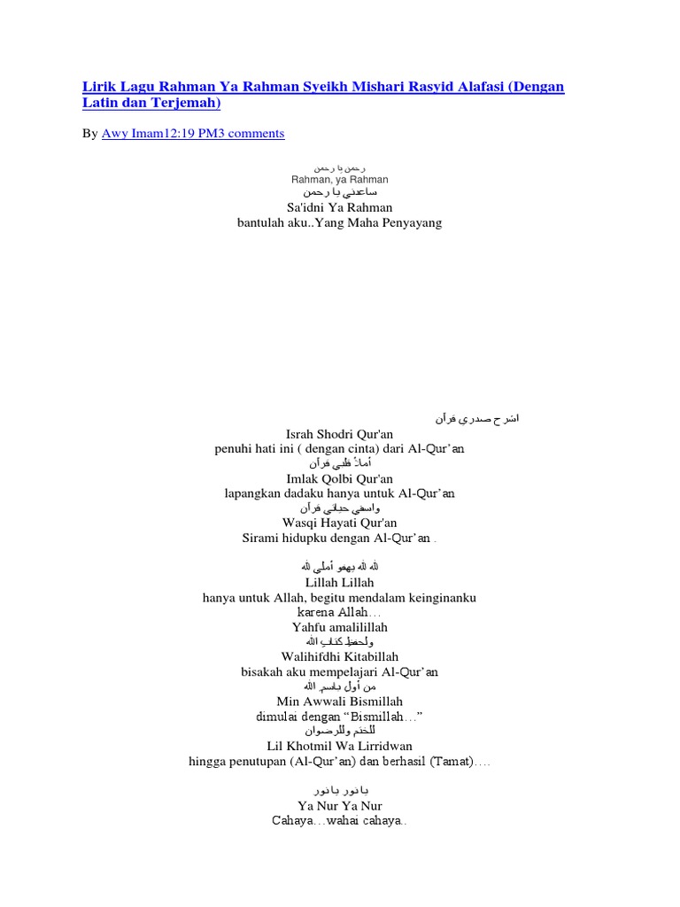 Lirik Lagu Rahman Ya Rahman Syeikh Mishari Rasyid Alafasi Dengan Latin Dan Terjemah