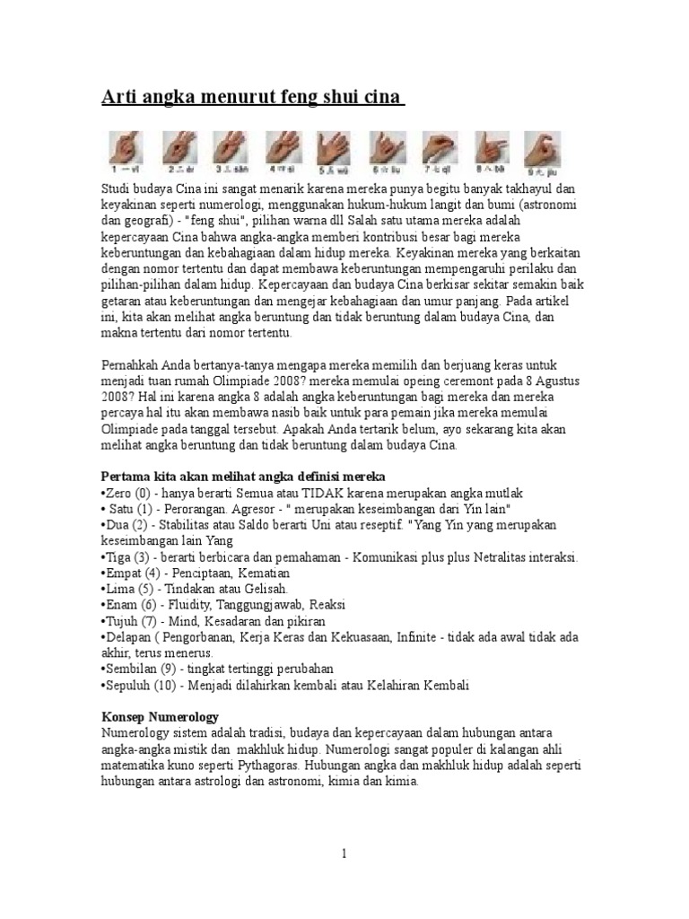 Di dalam kepercayaan cina angka memiliki arti sama dengan bagaimana ia diucapkan. Makna nombor dalam numerologi cina nombor 1 nombor 1 memberi maksud kuasa dan kekayaan kepada pemiliknya menjadikan nombor ini antara yang menjadi rebutan setiap kali tender nombor pendaftaran dibuka tafsiran nombor 1 ialah satu saya diri sendiri. Nombor 2 angka atau nombor 2 pula membawa maksud kebahagian dan kasih sayang. Namun begitu sesetengah orang cina memandang kepercayaan ini sebagai karut oleh sebab sebutan dan kosa kata banyak berbeza antara dialek dialek cina yang berlainan panduan ini tidak boleh digunakan secara am untuk segala hal.