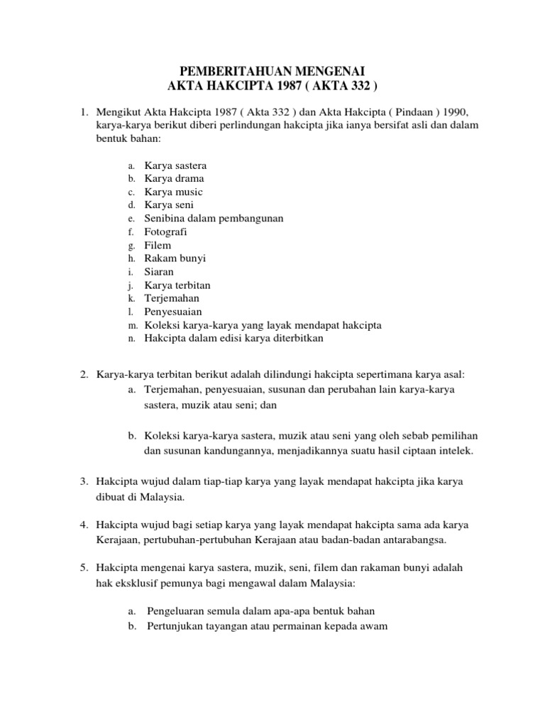Pemberitahuan Mengenai Akta Hakcipta 1987 Akta 332 A B C D E F G H I J K L M N
