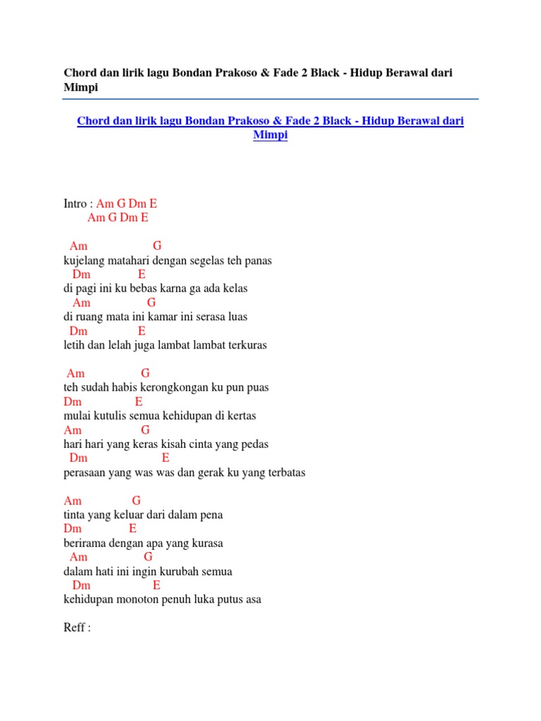 Chord Dan Lirik Lagu Bondan Prakoso Fade 2 Black Hidup Berawal Dari Mimpi