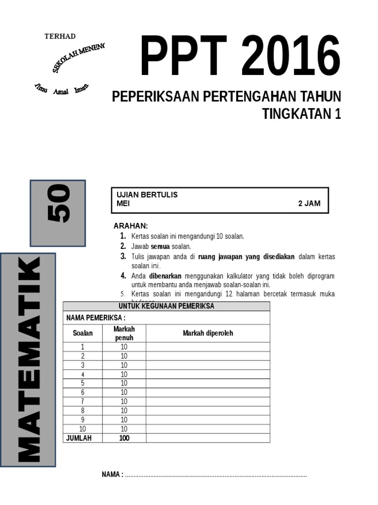 Contoh Muka Depan Kertas Soalan Peperiksaan Percubaan Pt3 Print